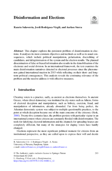 Salaverría, R., Rodríguez-Virgili, J., & Sierra, A. (2026). Disinformation and Elections. In Ginsborg, L., & Gori, P. (Eds.) Disinformation. A Multi-Disciplinary Analysis (pp. 213-226). Springer. ISBN: 978-3-032-00479-6. DOI:10.1007/978-3-032-00480-2_12